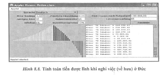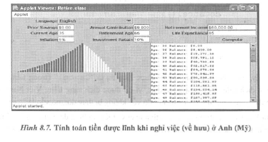 Ví dụ 8.6, Chương trình applet tính toán và hiển thị biểu đồ số tiền tiết kiệm và khả năng thu nhập khi nghỉ hưu (nghỉ làm việc) ờ nhiều nước khác nhau như hình 8.7, 8.8.