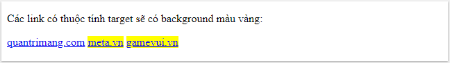 <!DOCTYPE html><html><head><style>a[target] {background-color: yellow;}</style></head><body><p>Các link có thuộc tính target sẽ có background màu vàng:</p><a href="https://quantrimang.com/">quantrimang.com</a><a href="https://meta.vn/" target="_blank">meta.vn</a><a href="https://gamevui.vn/" target="_top">gamevui.vn</a></body></html>