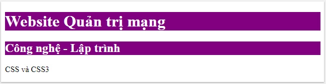 <!DOCTYPE html><html><head><style>[class|=top] {background: purple;color: white;}</style></head><body><h1 class="top-header">Website Quản trị mạng</h1><h2 class="top-text">Công nghệ - Lập trình</h2><p class="topcontent">CSS và CSS3</p></body></html>
