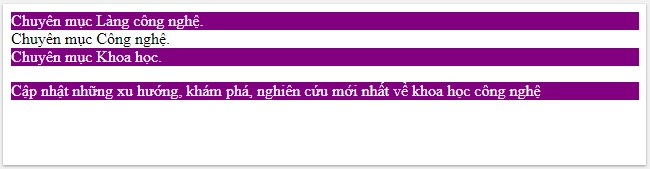 <!DOCTYPE html><html><head><style>[class*="test"] {background: purple;color: white}</style></head><body><div class="first_test">Chuyên mục Làng công nghệ.</div><div class="second">Chuyên mục Công nghệ.</div><div class="my-test">Chuyên mục Khoa học.</div><p class="mytest">Cập nhật những xu hướng, khám phá, nghiên cứu mới nhất về khoa học công nghệ </p></body></html>