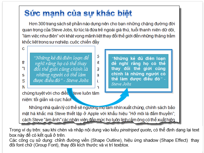 + Quote: có thể hiểu là các kiểu textbox được thiết kế theo dạng một hình chữ nhật, vị trí thường được đặt một cách tự do trong trang văn bản, kích thước được thiết lập ngẫu nhiên. Nội dung nhập trong textbox loại này thường là nội dung tóm tắt của tài liệu hay những điểm cần nhấn mạnh/thú vị trong tài liệu. Loại này sử dụng trong mọi loại tài liệu.