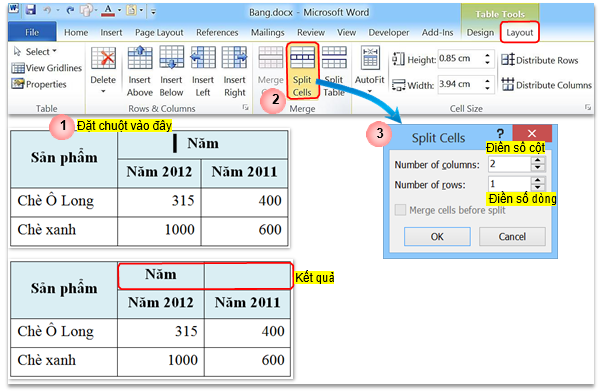 7. Merge Cells/ Split Cells/ Split Table – Trộn ô/Chia ô/ Tách bảng