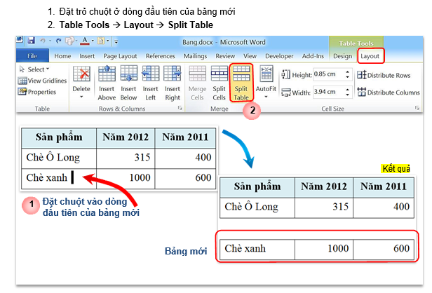 Tách bảng – Split Table : cho phép tách 1 Bảng thành 2 Bảng theo chiều ngang.