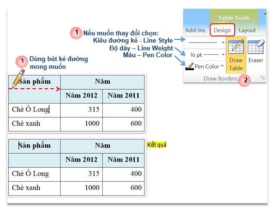 Draw Table là chức năng cho phép kẻ thêm các đường kẻ để chia ô tại bất kỳ vị trí nào. Nếu đặt bút gần với đường kẻ chính của bảng thì sẽ được tự động điều chỉnh sao cho thẳng với đường kẻ chính đó.