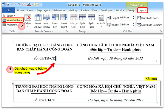 – Hiển thị Gridline đối với Bảng không viền đường kẻ : trong trường hợp dùng Bảng để trình bày văn bản. Đường Gridline chỉ hiển thị trong chế độ soạn thảo, khi in ra sẽ không có các đường Gridline. Cách hiển thị đường Gridline :