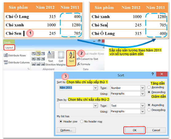 Mặc dù Word không phải là phần mềm chuyên làm việc với dữ liệu như Excel nhưng bạn vẫn có thể Sort – Sắp xếp dữ liệu trong bảng. Khi sắp xếp thì các dữ liệu trên cùng dòng sẽ luôn đi cùng nhau.
