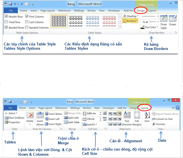 – Tab Layout: chứa các nhóm lệnh liên quan tới Dòng & Cột, kích cỡ ô – chiều cao dòng, độ rộng cột, căn lề, lặp lại dòng tiêu đề của bảng, …