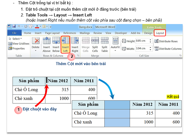 Chú ý: Khi làm việc với Bảng, có thể bấm phải chuột vào Dòng/ Cột/ Ô để hiển thị một số lệnh cơ bản làm việc nhanh với Bảng. Các lệnh này tương đương với các lệnh trên Table Tools.