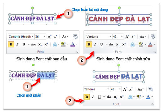 Khung chứa chữ nghệ thuật có thể coi là một shape hình chữ nhật (hoặc một textbox) vì vậy có thể áp dụng tất cả các định dạng Font chữ (trên group Font ) cho nội dung chữ nghệ thuật.