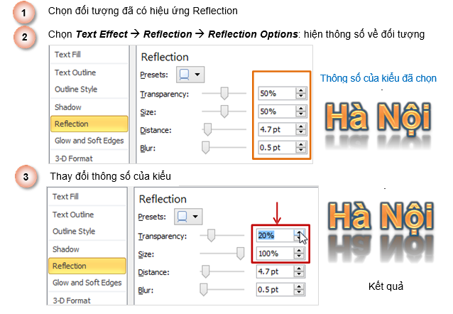 Ví dụ 2: Áp dụng Text Effect kiểu Reflection (Tight Reflection, 8pt offset) cho chữ nghệ thuật, sau đó điều chỉnh các thông số của kiểu này (Reflection Options).