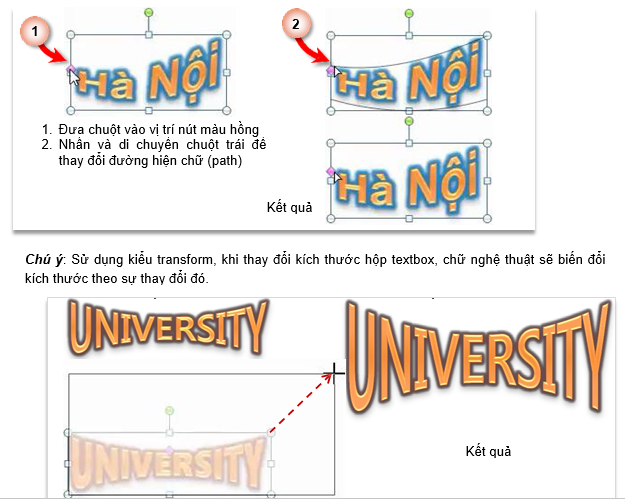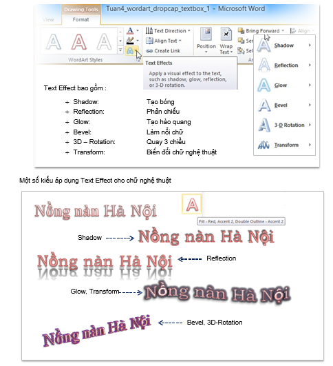 Cách thực hiện hiệu ứng Text Effect cho chữ nghệ thuật tương tự như tạo hiệu ứng Shape Effect cho hình khối (tham khảo Shape Effect).