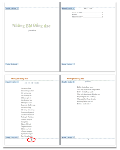 + Thêm Header/ Footer khác nhau giữa các Section.