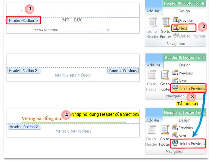 - Nếu không tắt nút này thì Header Section 1 sẽ có nội dung giống Header Section 2 sẽ được nhập trong Bước 4;