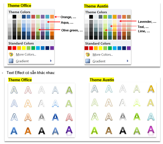 – Hình sau cho bạn thấy sự khác nhau giữa bảng màu của Theme Office mà bạn thường dùng và bảng màu của Theme Austin.