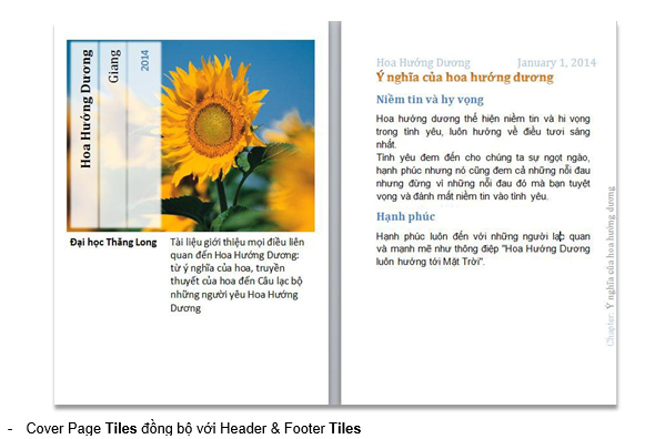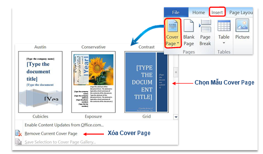 Cover Page: là trang bìa được thiết kế sẵn, bạn chỉ cần chọn kiểu thích hợp và điền thông tin của mình vào. Cover Page được thiết kế đồng bộ với Header & Footer. Bạn có thể chọn theo tên.