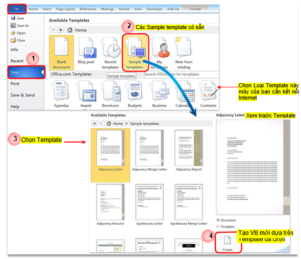 – MS Word cung cấp rất nhiều Template sẵn theo mẫu của nƣớc ngoài. Bạn có thể tạo văn bản mới sử dụng các Template này như sau :