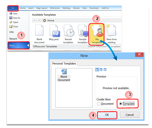 - Khi lưu văn bản, thư mục mặc định là */Microsoft/Template. Nếu bạn lưu vào đây thì khi New văn bản mới, bạn có thể chọn trong mục My template. Tuy nhiên bạn sẽ khó quản lý file này. Do vậy tốt nhất là lưu vào thư mục làm việc thường xuyên của bạn.