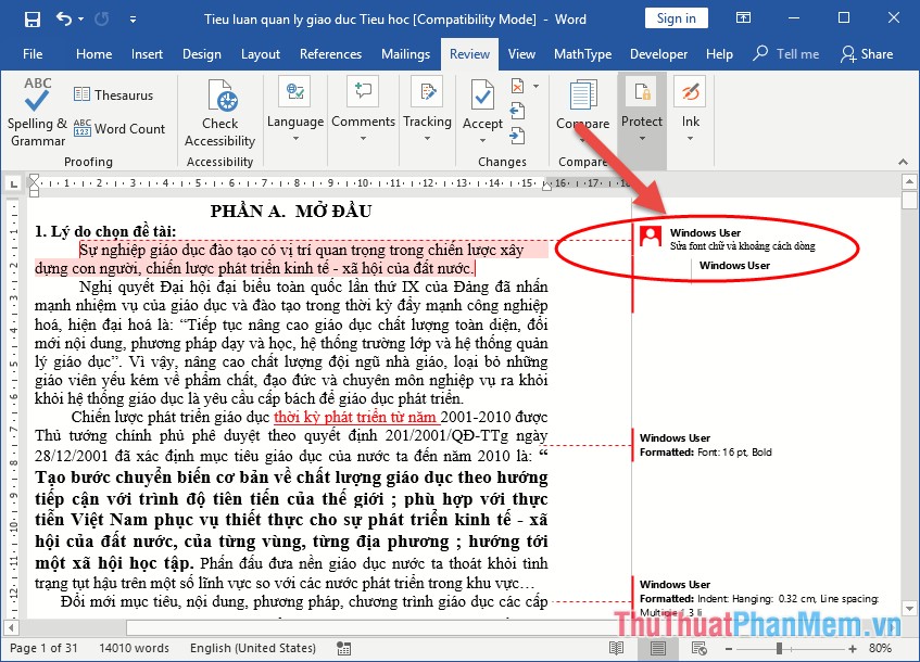 Khi Track Changes được kích hoạt nó tô đậm như hình vẽ: