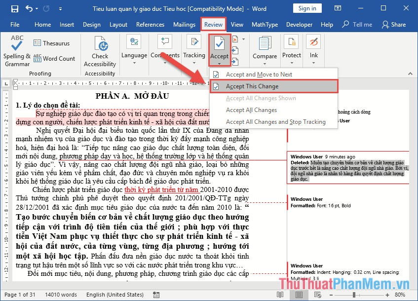 Với nội dung đồng nghiệp đã chỉnh sửa nếu đồng ý bạn vào thẻ Review -> Accept -> Accept This Change: