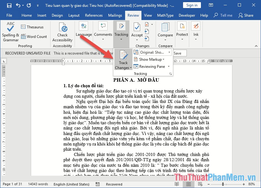 Bước 1: Thực hiện mở tài liệu dùng chung, kích hoạt Tracks Changes bằng cách vào thẻ Review -> Tracking -> kích chọn Track Changes: