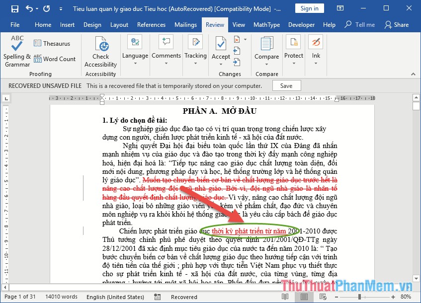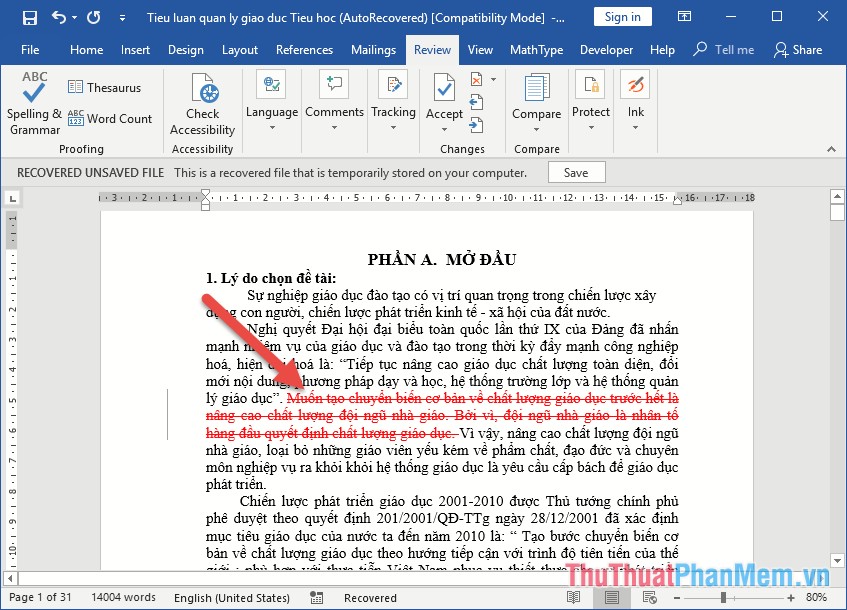 Bước 2: Sau khi kích hoạt chế độ Track Change người dùng tùy ý chỉnh sửa nội dung. Ví dụ muốn xóa bỏ 1 đoạn trong tài liệu dùng chung -> nội dung không bị xóa bỏ mà sẽ được tô màu đỏ và chữ bị gạch ngang như hình: