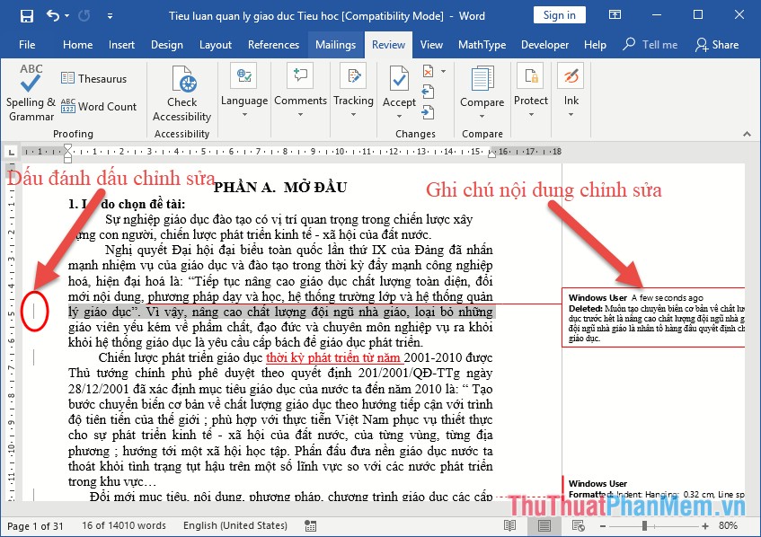 Track Changes là ứng dụng trong Word được sử dụng để sửa đổi văn bản nhưng vẫn giữ được văn bản gốc. Khi sử dụng Track Changes, mọi thay đổi của văn bản sẽ được lưu lại và hiển thị trên Word.