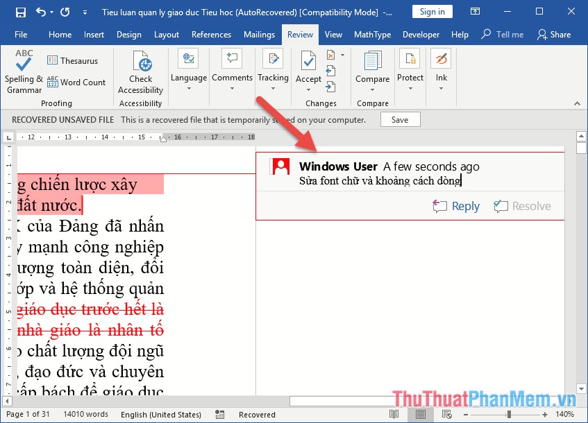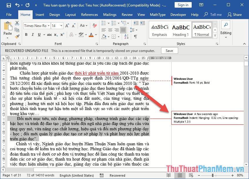 Đồng thời phía lề bên trái tự động tạo dấu gạch đỏ đánh dấu vị trí đã chỉnh sửa, bạn kích chọn vào dấu này để hiển thị nội dung chữ đã bị chỉnh sửa hoặc ẩn nó đi tùy ý, ghi chú việc chỉnh sửa của bạn được tạo bên phải của tài liệu: