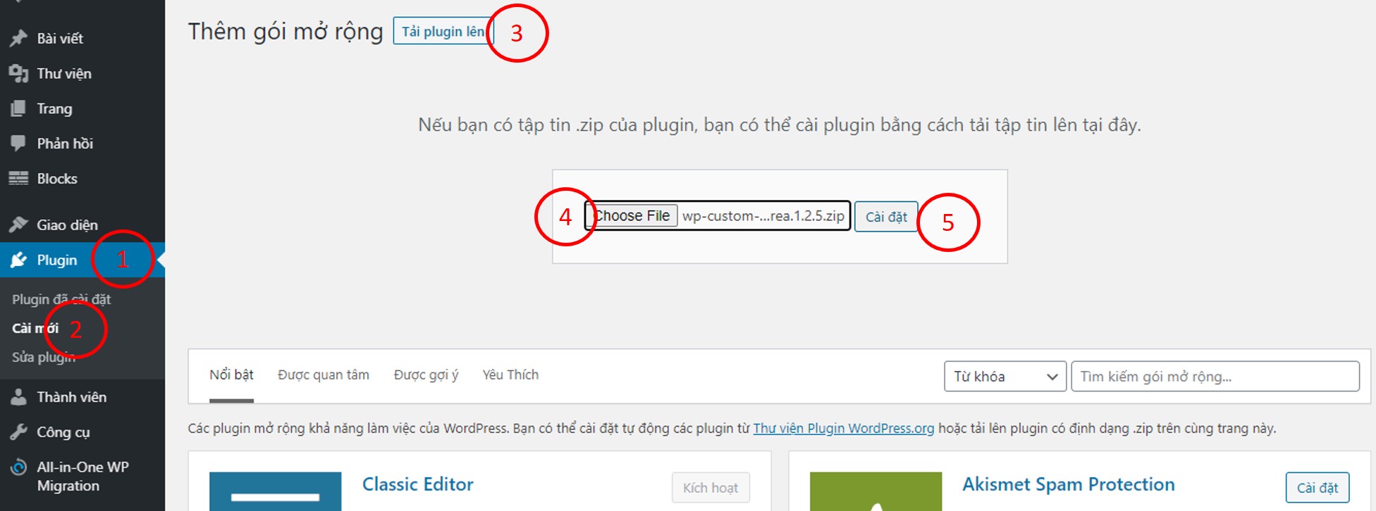 Trên menu bên trái, click vào Plugin > Cài mới; tiếp theo click Tải plugin lên, rồi chọn Choose File. Ở cửa số giao diện mới mở ra, tìm chọn đúng plugin vừa tải về, rồi click Cài đặt.
