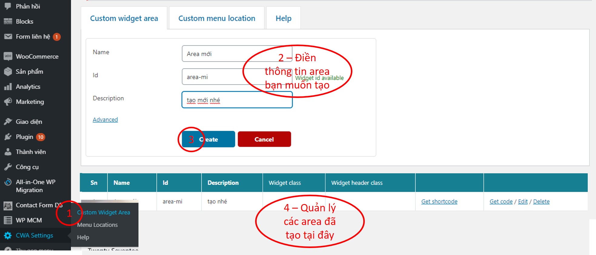 Trên menu bên trái, click chọn CWA Settings mới được thêm vào, rồi chọn Custom Widget Area, ở giao diện này, hãy nhập đầy đủ tên khu vực mới cần tạo, trường Id sẽ tự tạo nên bạn có thể để mặc định; desciption miêu tả có thể nhập hoặc không. Cuối cùng, click tạo Create, vùng widget area mới tạo ra sẽ hiển thị ở danh sách phía dưới.