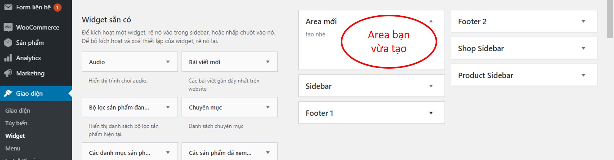 Xong rồi, giờ thì vào hệ thống quản trị WordPress và chọn Theme => Widget bạn sẽ thấy Widget Area mới, kéo Widget vào vùng mới bạn sẽ có thể thấy nó hiển thị ra bên ngoài.