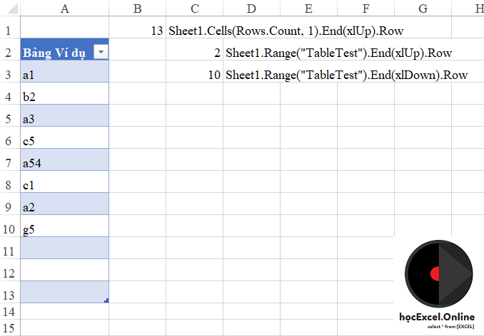 Như vậy chúng ta có thể thấy cách sử dụng xlDown sẽ cho chúng ta đúng dòng cuối cần tìm trong Table