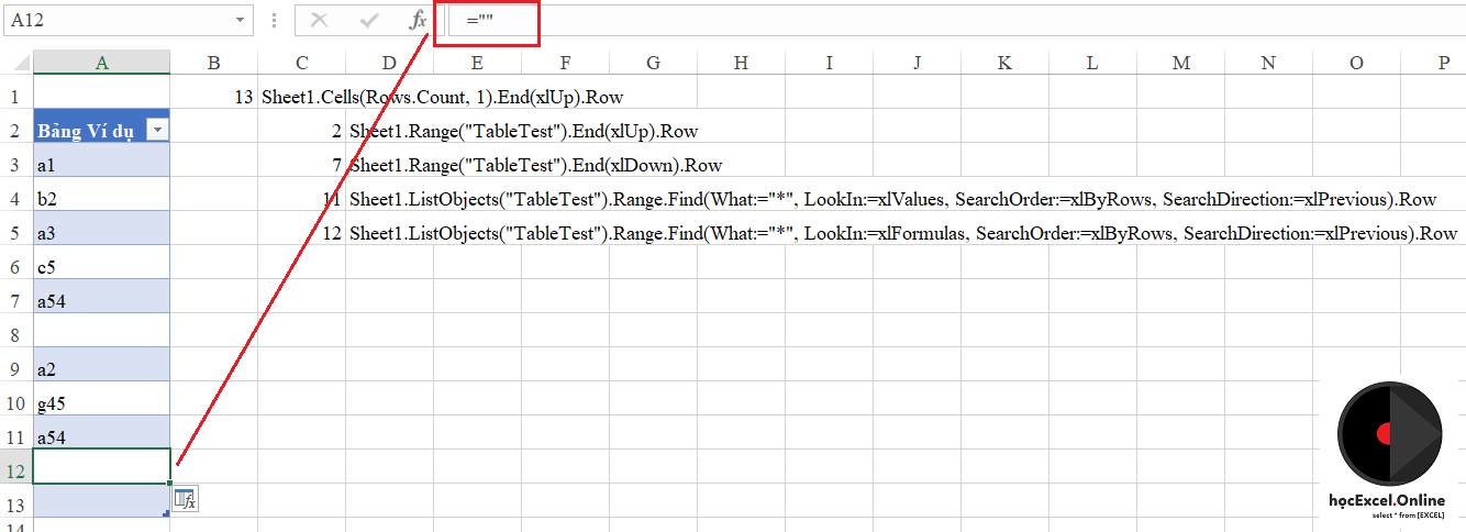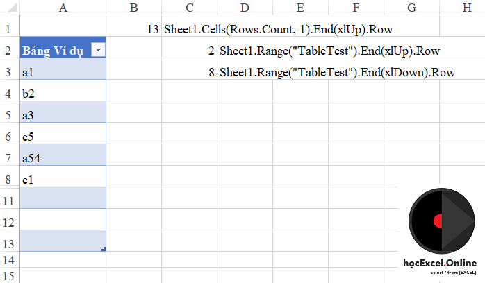 => Việc ghi nhận dòng cuối theo cách này được hiểu là tới dòng cuối của bảng Table đang áp dụng, không phụ thuộc phía trong nó có dữ liệu hay không