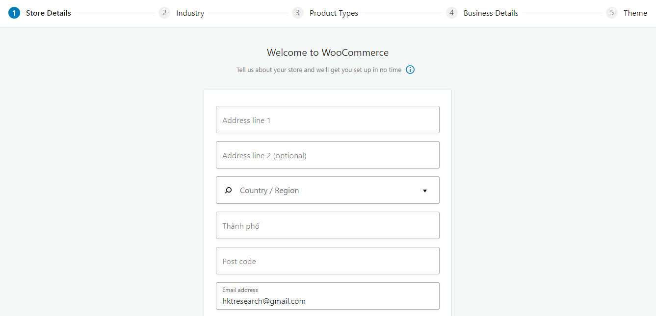 Bước 1: Store Details. Tại đây, WooCommerce đang nhắc Bạn nhập một số thông tin cơ bản như địa chỉ, mã bưu chính, email về cửa hàng của Bạn.