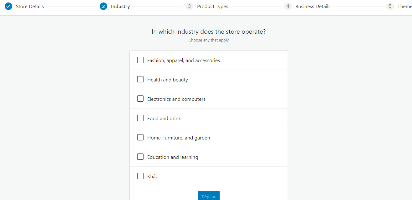 Bước 2: Industry. Tích chọn ngành nghề cho Website bán hàng Online của bạn.