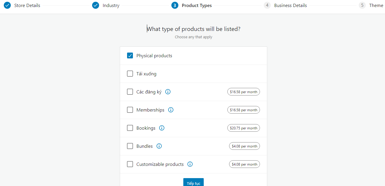 Bước 3: Product Types. Tích chọn sản phẩm mà Website của bạn kinh doanh.