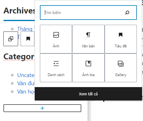Để thêm một widget, bạn click vào vị trí cần đặt widget, rồi bạn click vào nút có dấu “+”. Một danh sách các widget được liệt kê ở đây và bạn chỉ cần chọn một widget mình muốn hoặc dùng nút search để tìm tên widget.