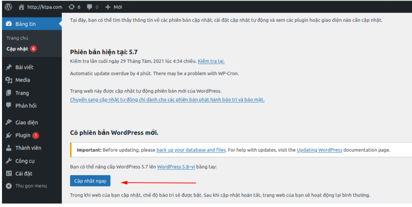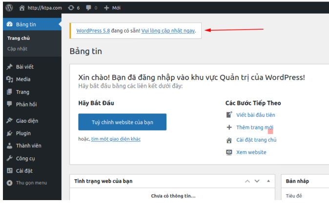 1. Nâng cấp phiên bản WordPress qua trang quản trị của WordPress