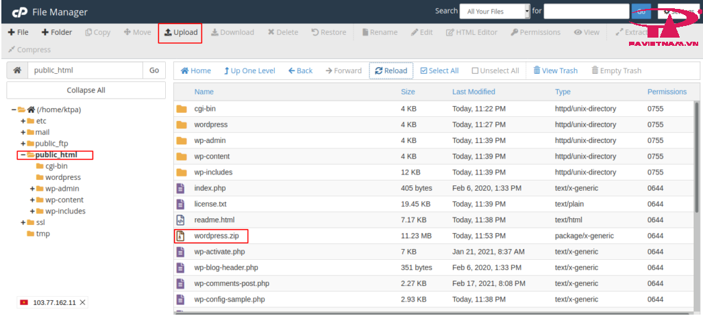 Bạn nén wordpress lại thành file .zip để tiến hành upload lên thư mục chứa dữ liệu trên hosting.