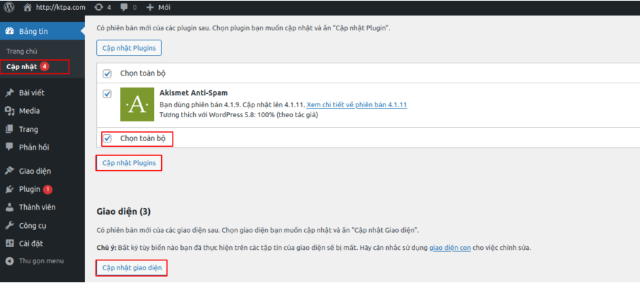 Bạn chỉ cần click vào nút Chọn toàn bộ và click vào Cập nhật Plugins với Cập nhật giao diện để cập nhật theo nhu cầu.