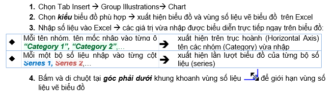 - Sửa số liệu cũng như chọn lại vùng số liệu vẽ biểu đồ (bằng cách bấm và di chuột tại góc phải dưới của khung khoanh vùng số liệu )