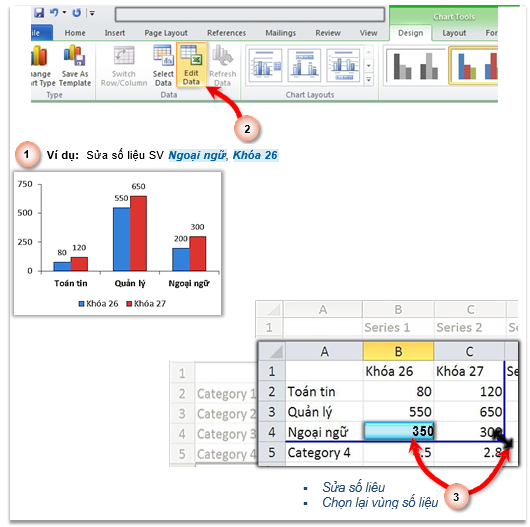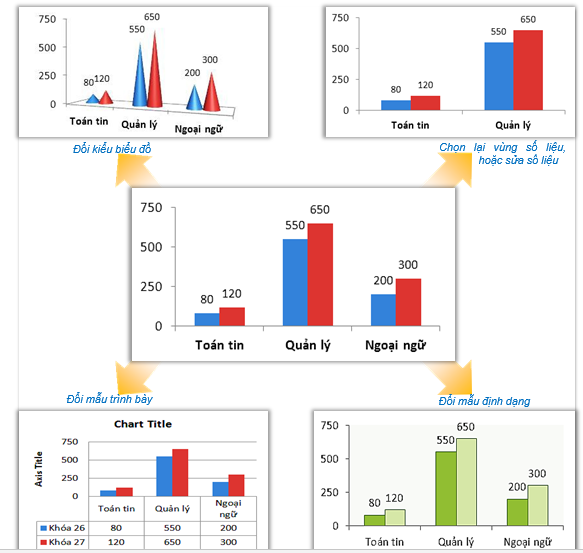 Chỉnh sửa biểu đồ là những thay đổi về thiết kế (Design) như: đổi kiểu biểu đồ, chọn lại vùng số liệu vẽ biểu đồ để thêm bớt số liệu, đổi mẫu trình bày, mẫu định dạng… (xem hình)