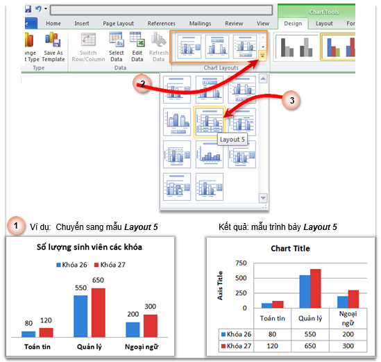 - Chọn Chart Tools à Design à Chart Layoutsà Chọn nút More trên Quick Layout