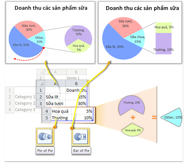 + Biểu đồ tròn Pie of Pie, Bar of Pie là biểu đồ trong đó một miếng thành phần được biểu diễn chi tiết bởi một biểu đồ con