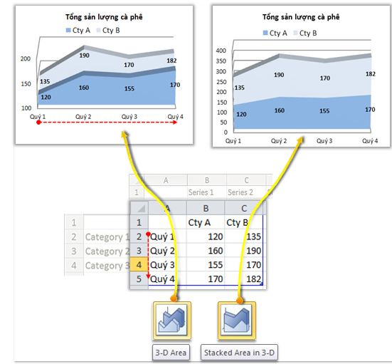 + Cách nhập số liệu cho các biểu đồ miền (Area, Stacked Area, 100% Stacked Area, 3-D Area, Stacked Area in 3-D, 100% Stacked Area in 3-D …) là như nhau.
