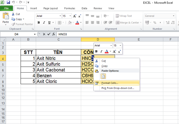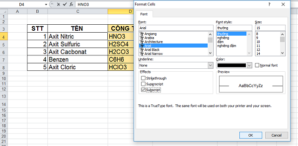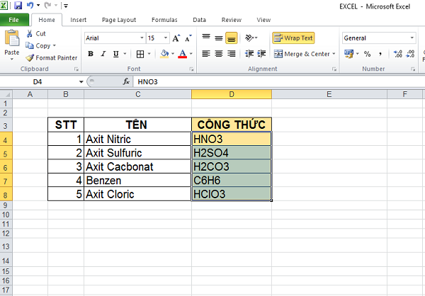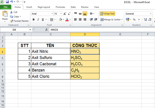 Chẳng hạn, bạn muốn nhập công thức Hóa học chuẩn cho bảng số liệu sau:
