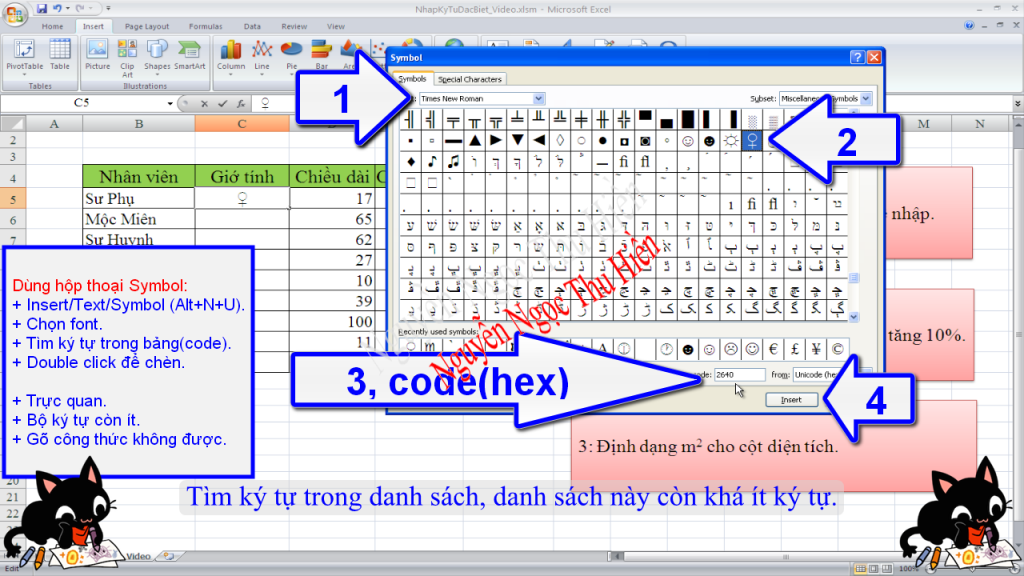 + Dùng chuột tìm ký tự đặc biệt (2) hoặc nhập code nếu biết (3), ký tự
