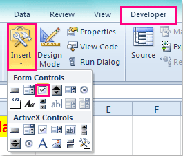 - Chọn Developer trên thanh công cụ, sau đó nhấn Insert, và chọn hình checkbox dưới Form Control. Hãy nhìn hình bên dưới.
