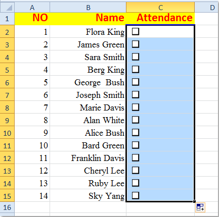 - Chọn ô có checkbox, và dùng fill handle để sao chép chúng qua dãy các ô khác bạn muốn. Hãy nhìn hình sau: