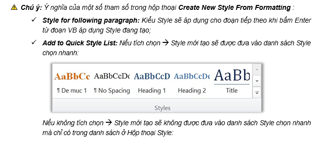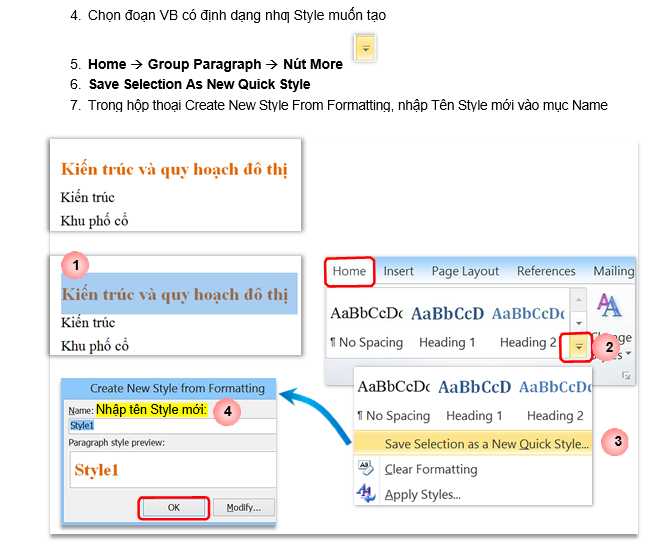 + Tạo Style dựa trên một đoạn văn bản đã định dạng – Save Selection As New Quick Style;