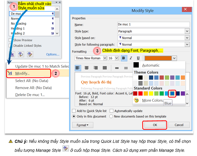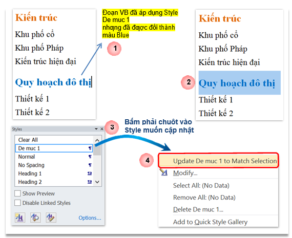– VD sau muốn tất cả các đề mục áp dụng Style De muc 1 chuyển màu chữ thành Blue: